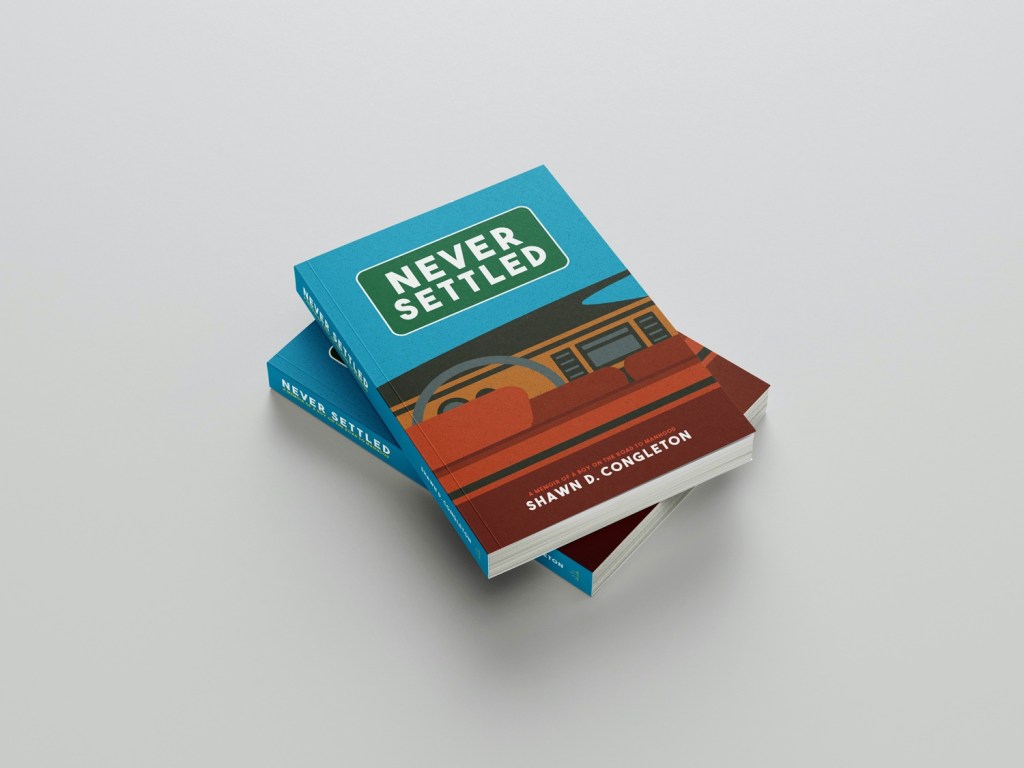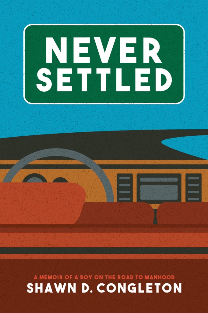 The official cover for my book, NEVER SETTLED: a memoir of a boy on the road to manhood by Shawn D. Congleton, designed by Brenna Myers.